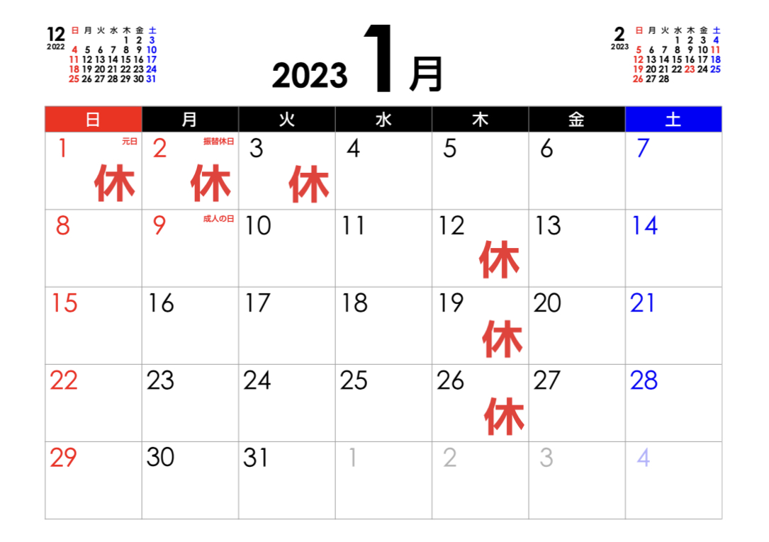 2023年1月の営業予定